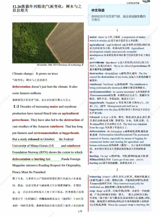 推荐理由:环保是全球热门话题,文章用词简单易懂,多为日常词汇(如“tree(树木)”“climate(气候)”“environment(环境)”),句式简洁,论证逻辑清晰,从“树木如何影响气候”展开,层层递进,容易理解。文中还会涉及“carbon(碳)”“planting trees(植树)”等基础短语,既能积累词汇,又能培养逻辑阅读能力,适合入门者逐步适应外刊的表达节奏。