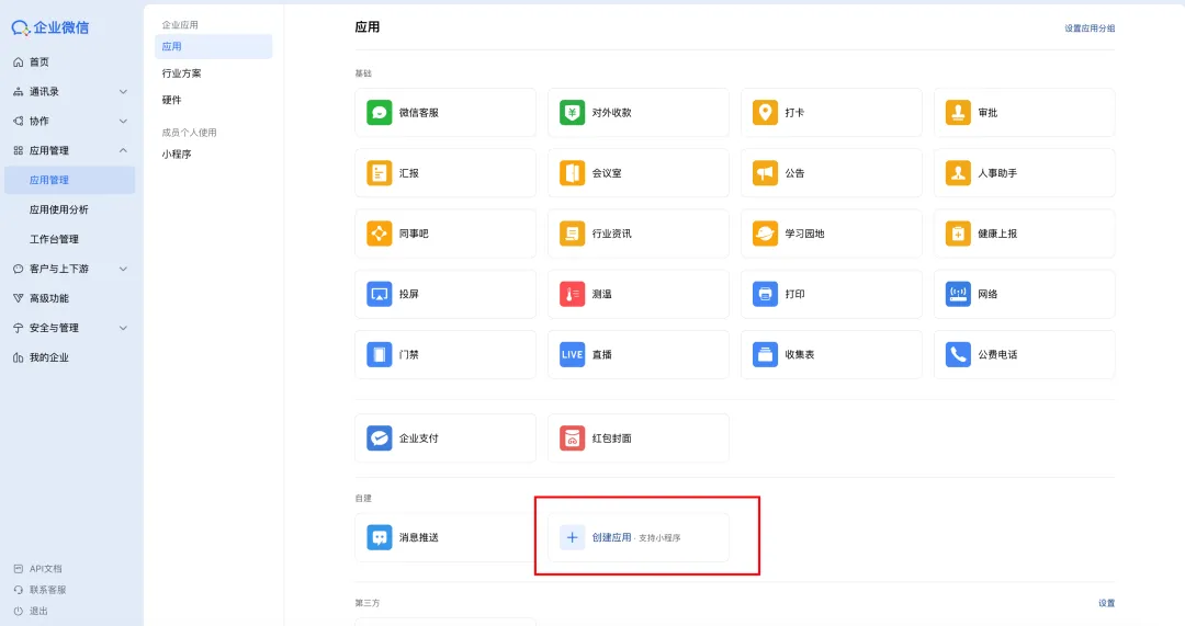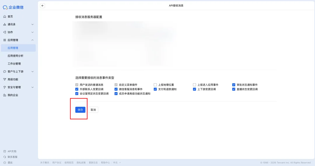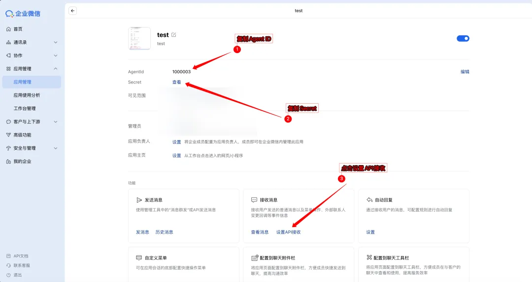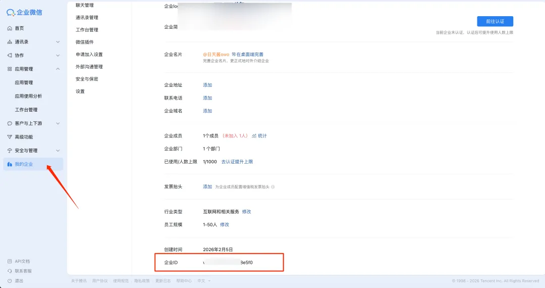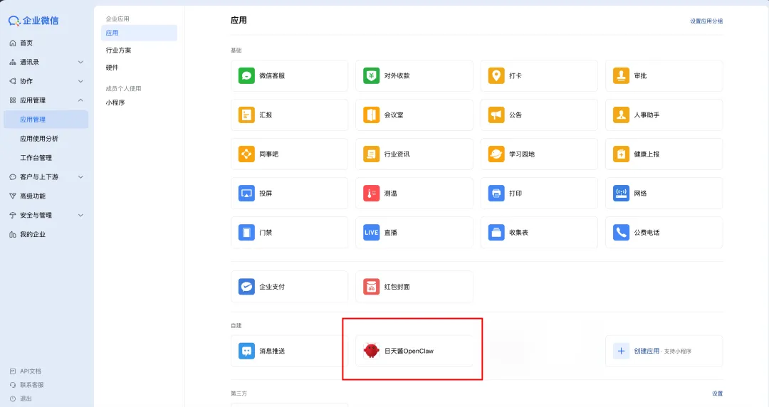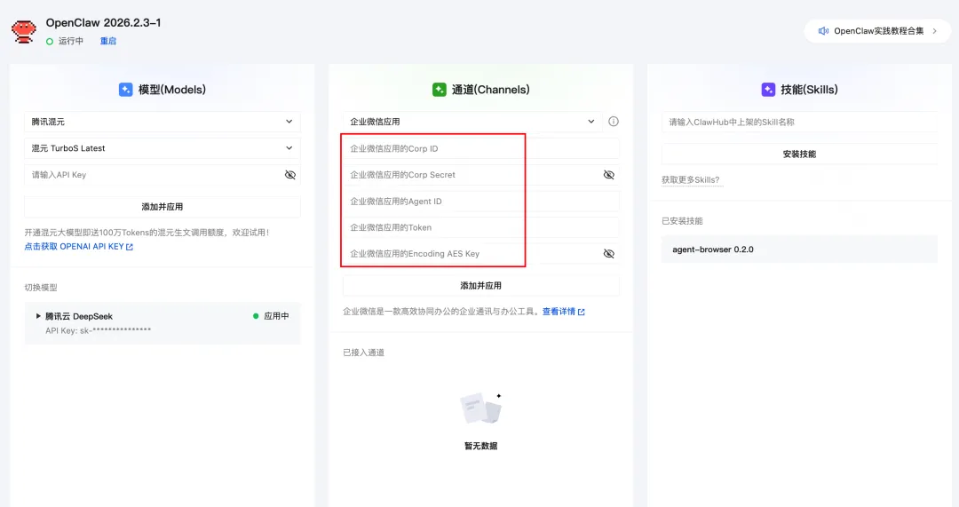 登录企业微信管理后台,在应用管理页面中,创建对接OpenClaw的应用:在创建应用页面中,设置应用logo、应用名称、应用描述以及应用的其他属性:在企业管理页面中,获取企业微信的企业ID,提供给OpenClaw服务器端网络通道,对接企业微信应用:在应用管理页面中,查看已创建的OpenClaw应用:在已创建的OpenClaw应用管理页面中,获取应用的Agentid以及应用的密钥,提供给OpenClaw服务器端网络通道,对接企业微信应用:在腾讯云业务管理控制台的服务器实例管理页面中,查找已创建的OpenClaw服务器实例,获取OpenClaw服务器端的IP地址:在已创建的OpenClaw应用管理页面中,设置OpenClaw服务器端的可信任IP地址,用于授权鉴权:在已创建的OpenClaw应用管理页面中,设置接收消息的模式为使用API接收,设置与OpenClaw服务器端消息交互的URL链接地址,获取用于鉴权授权的Token以及密钥,提供给OpenClaw服务器端网络通道,对接企业微信应用:| http://OpenClaw服务器端的IP地址:18789/wecom/agent |