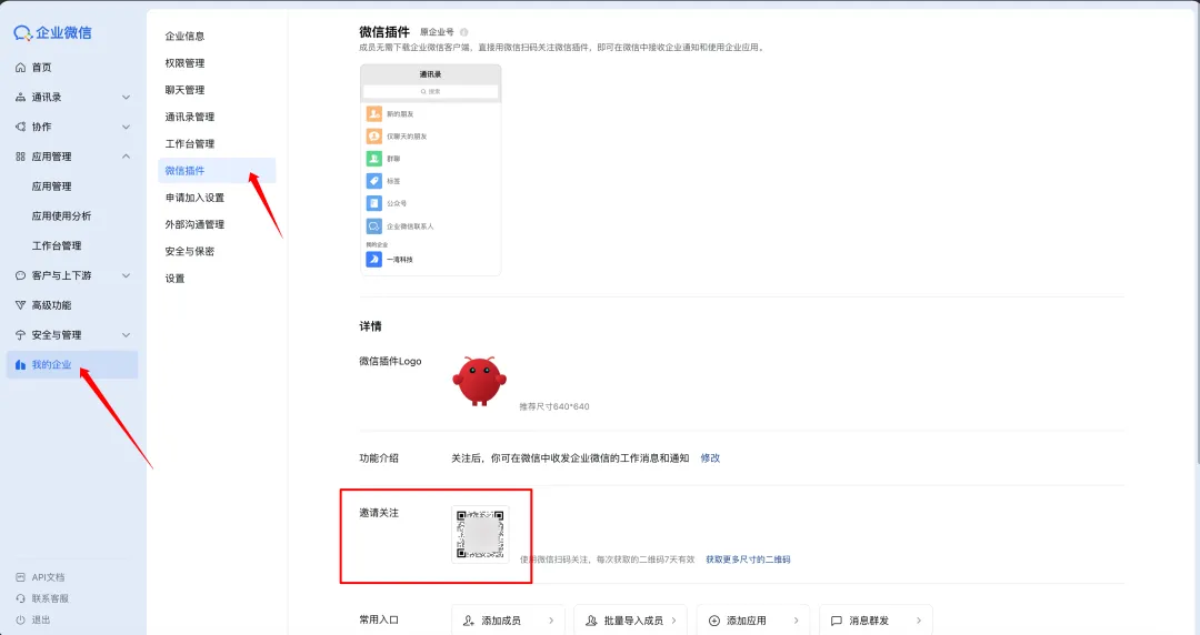 在腾讯云业务管理控制台的服务器实例管理页面中,查找已创建的OpenClaw服务器实例,设置对接企业微信网络通道的属性,包括企业微信的企业ID、企业微信的应用ID以及用于鉴权授权的token与密钥:在已创建的OpenClaw应用管理页面中,保存属性配置,完成应用的创建:在企业微信的插件管理页面中,使用个人微信扫描已创建的OpenClaw应用的二维码,关注应用,即可在个人微信中开始与OpenClaw智能体对话: