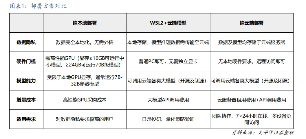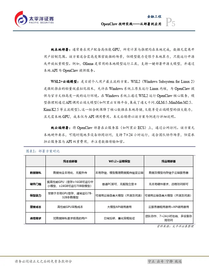 OpenClaw 的部署方式可划分为三类主流方案,分别是纯本地部署、WSL2+云端模型、纯云端部署,分别适用于对数据隐私、计算资源、网络依赖及成本有不同需求的用户场景。三类方案在数据存储位置、硬件要求、模型能力及成本结构上存在显著差异,用户可根据自身需求选择,不同方案将影响后续应用的边界与使用体验。