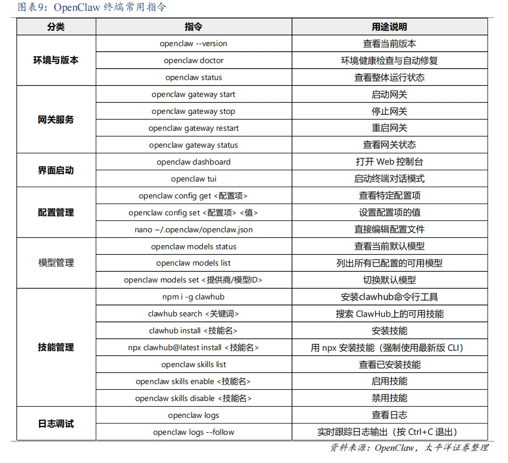 OpenClaw 提供丰富的命令行工具,以下按功能分类列出常用指令。部分关键配置变更操作执行后,需重启网关才能使修改生效。