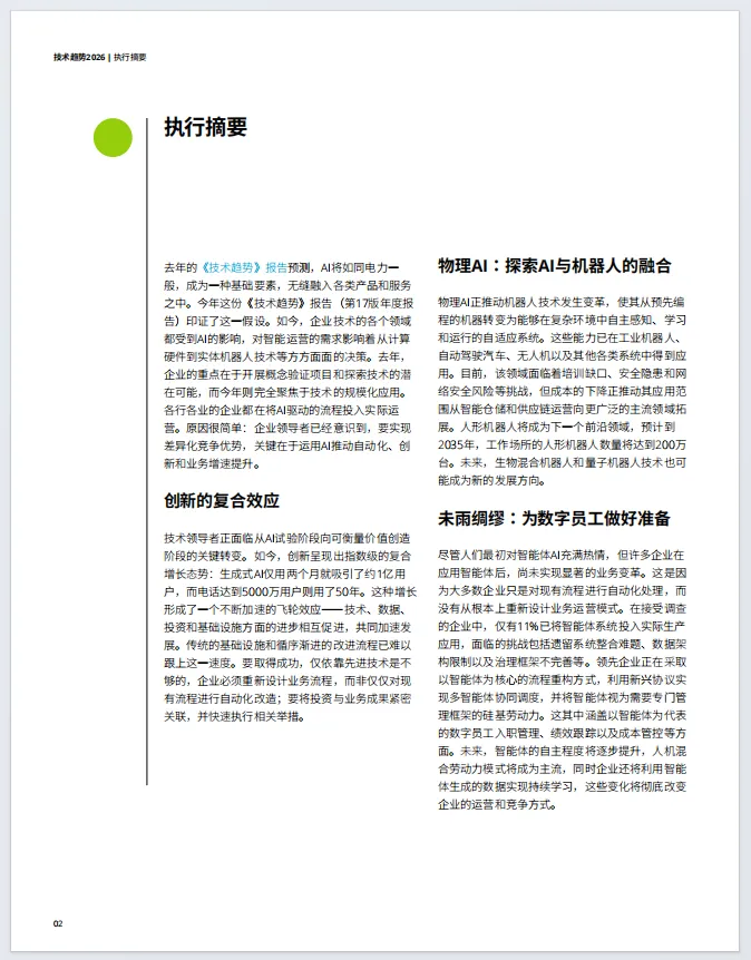 全球知名专业服务机构德勤正式发布《2026技术趋势》报告,这是德勤连续第17年发布该年度报告。报告深入探讨了人工智能(AI)、机器人技术、云计算、边缘计算等前沿技术在未来18至24个月内的发展趋势,指出企业AI应用正从概念验证阶段迈向技术的实际价值创造阶段,其核心在于通过AI推动自动化、创新和业务增长的系统性提升。