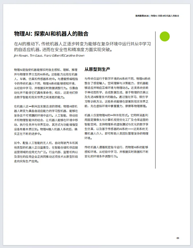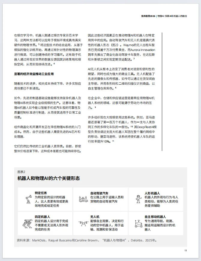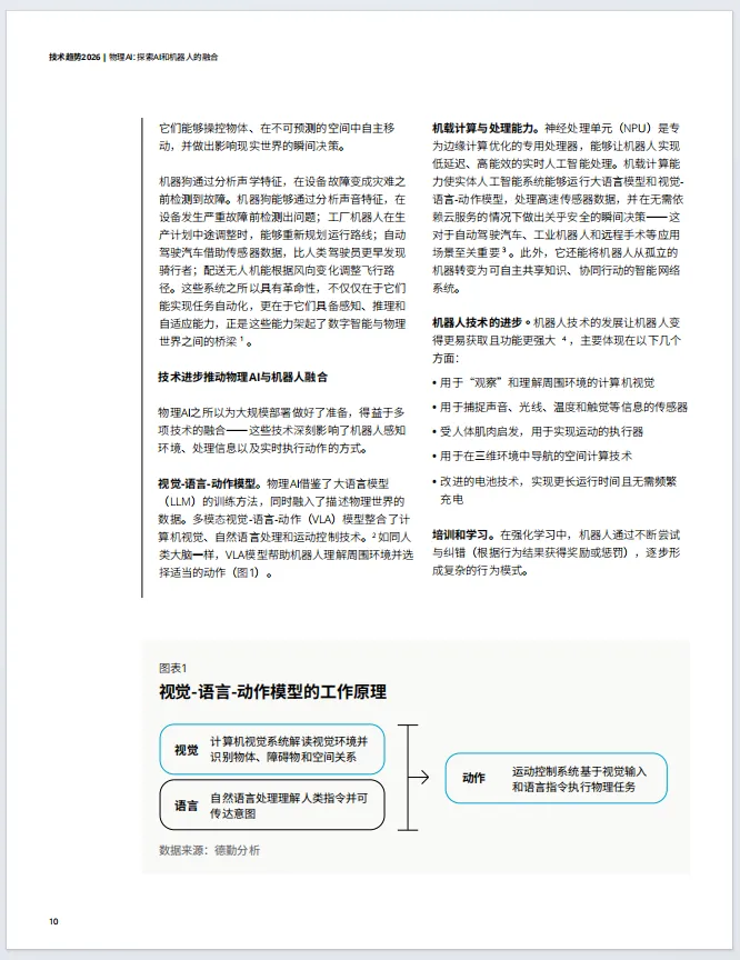 物理AI让机器人从预编程机器变为能在复杂环境自主感知、学习的自适应系统。依托视觉-语言-动作模型、机载计算等技术,物理AI已在仓储、制造、自动驾驶等领域落地。亚马逊已部署第100万台机器人,其DeepFleet AI模型协调整个机器人舰队,将仓库内机器人行驶效率提高了10%;宝马工厂的新车能自主驾驶通过长达一公里的生产线。
