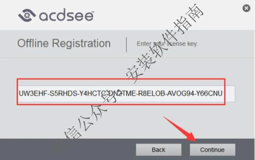 12、复制序列号:UW3EHF-S5RHDS-Y4HCTC-DN2TME-R8ELOB-AVOG94-Y66CNU粘贴到框里面,然后点Continue,进行下一步。