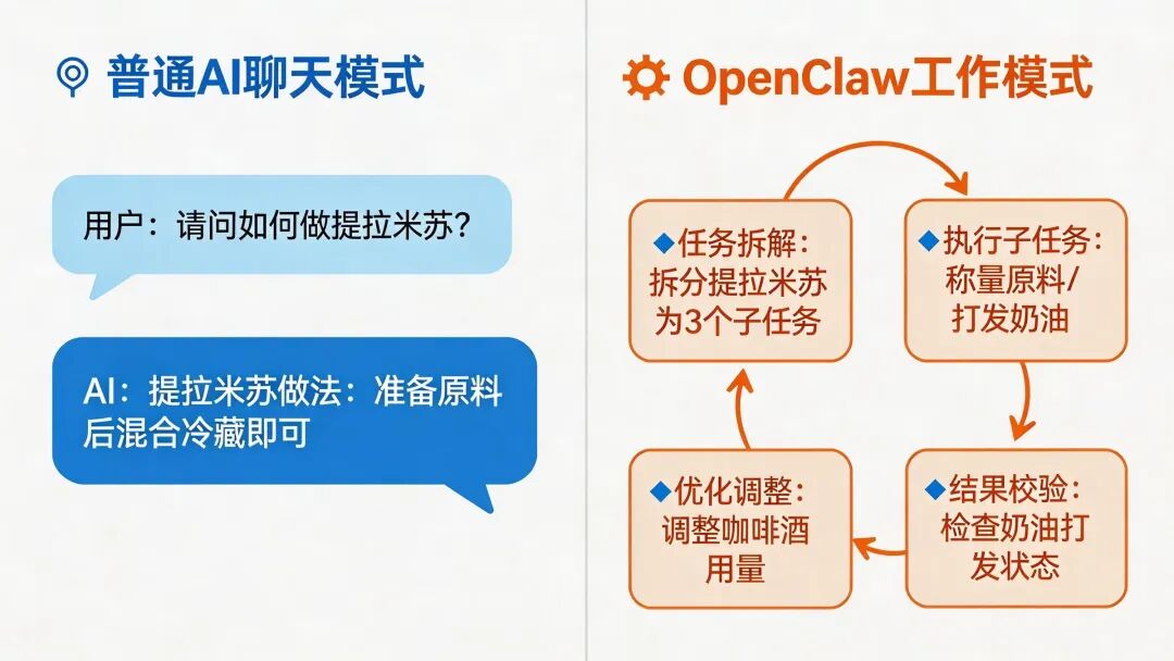 普通AI:帮我写一篇文章 → 一次完成OpenClaw:① 去搜索资料② 分析多个网页③ 反复筛选信息④ 最后生成内容