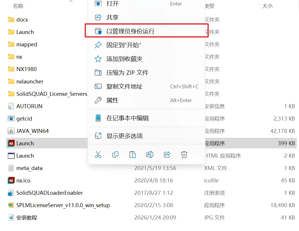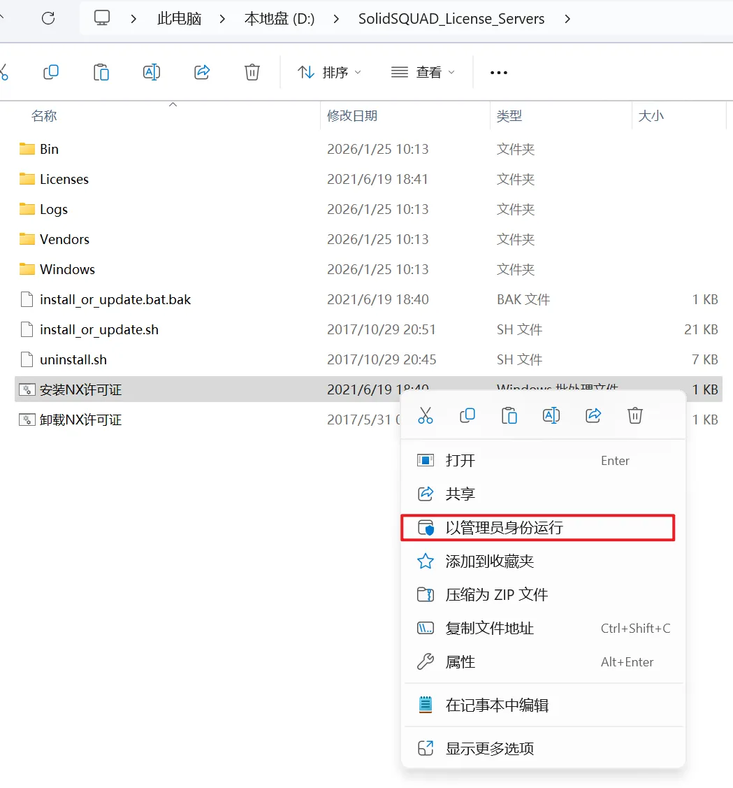 2.1Ctrl+V粘贴到盘符根目录下,鼠标右键NX许可证服务器以管理员身份运行