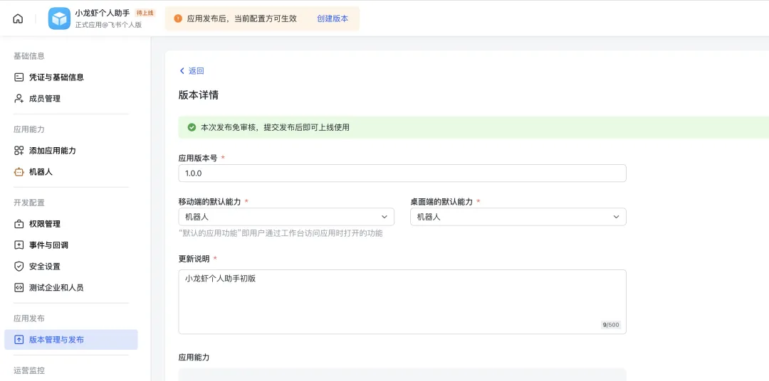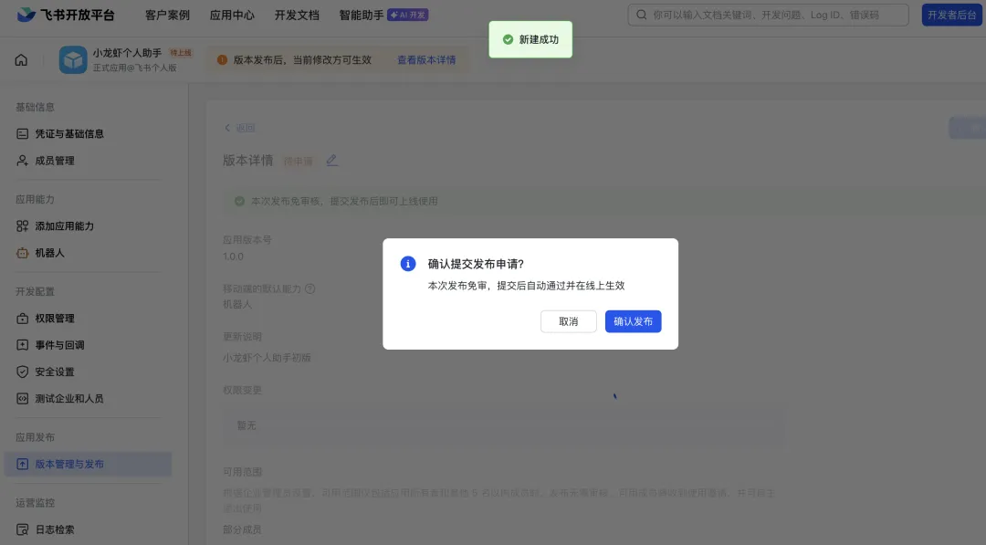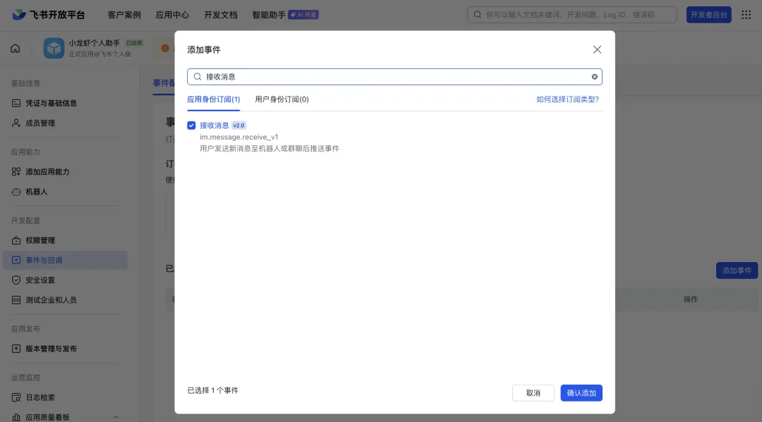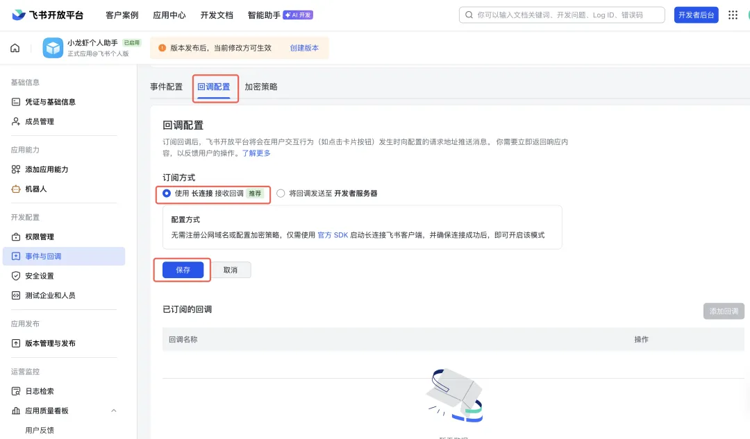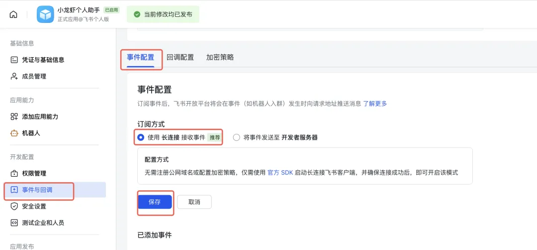 如果这一步报错提示“应用未建立长连接”,请检查前面步骤中的机器人App ID和App Secret是否已正确配置。