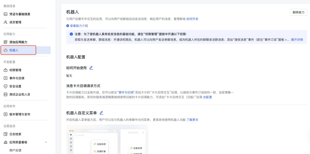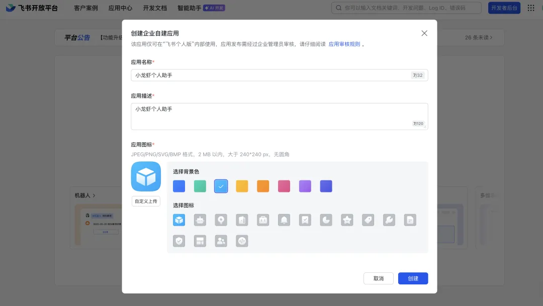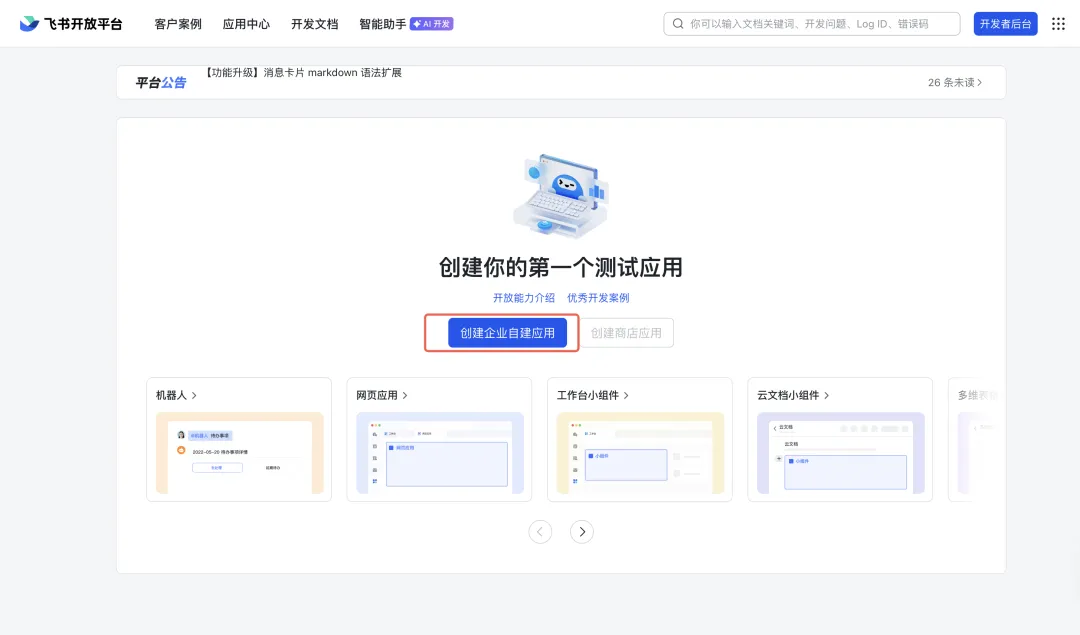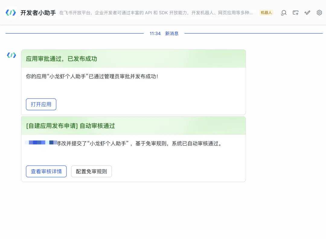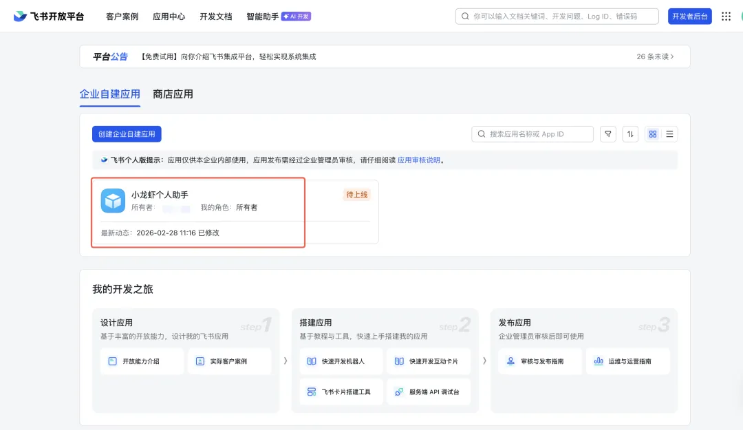 如果这一步报错提示“应用未建立长连接”,请检查前面步骤中的机器人App ID和App Secret是否已正确配置。