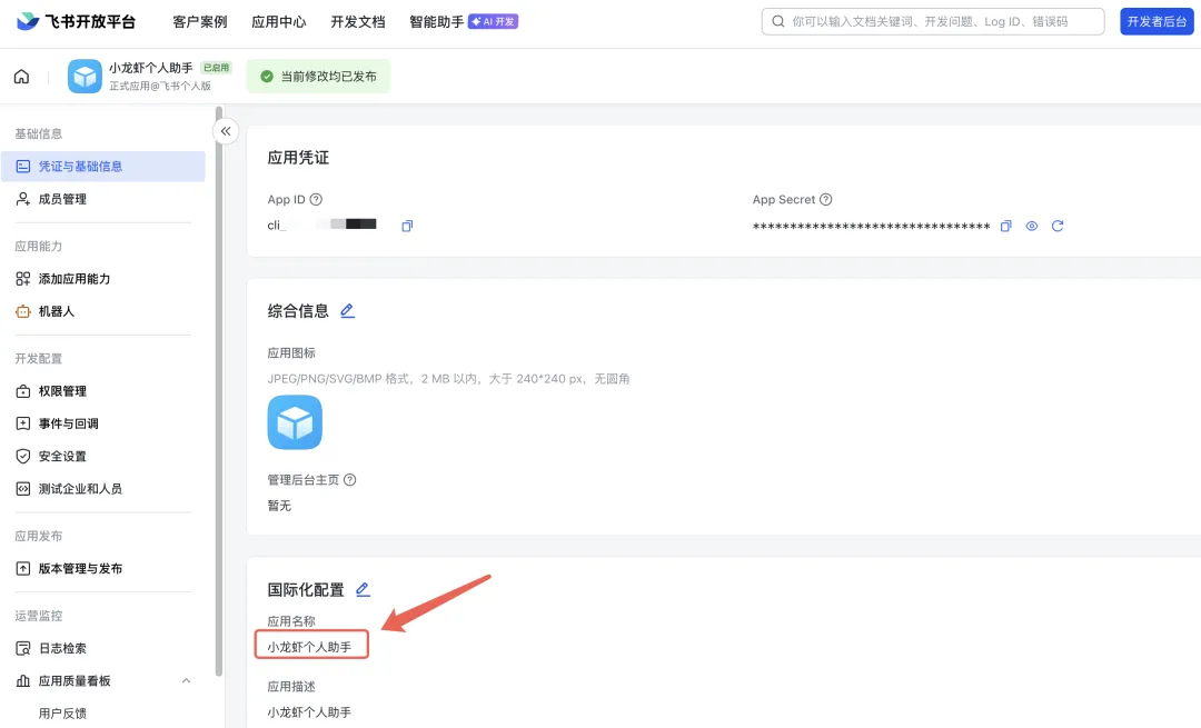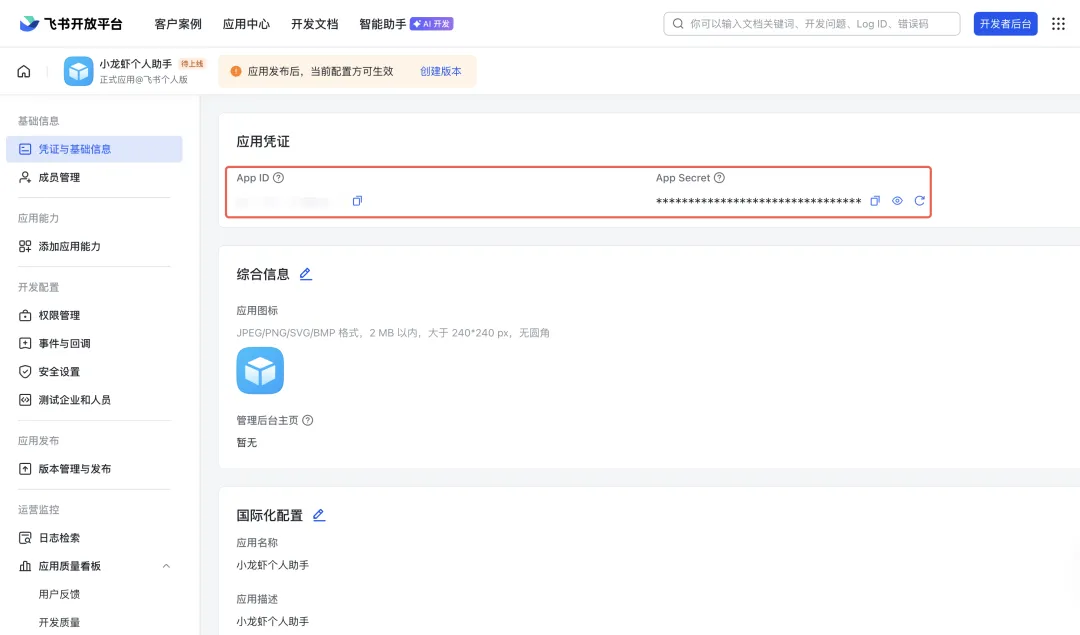 复制APP ID 和 App Secret ,后面关联 OpenClaw 使用