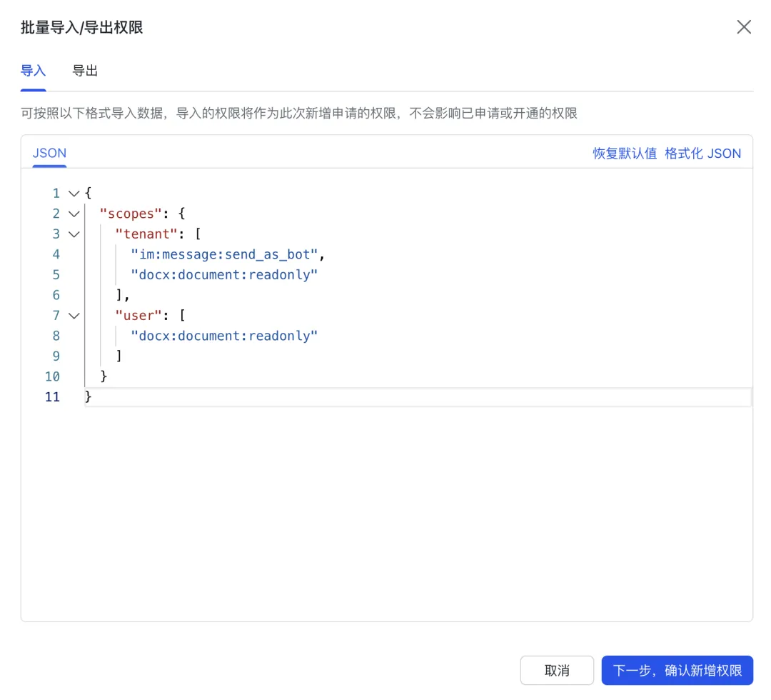 复制以下内容,粘贴到上图,点“下一步,确认新增权限”