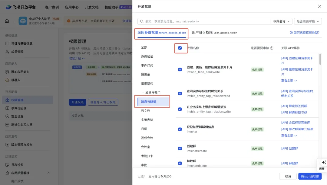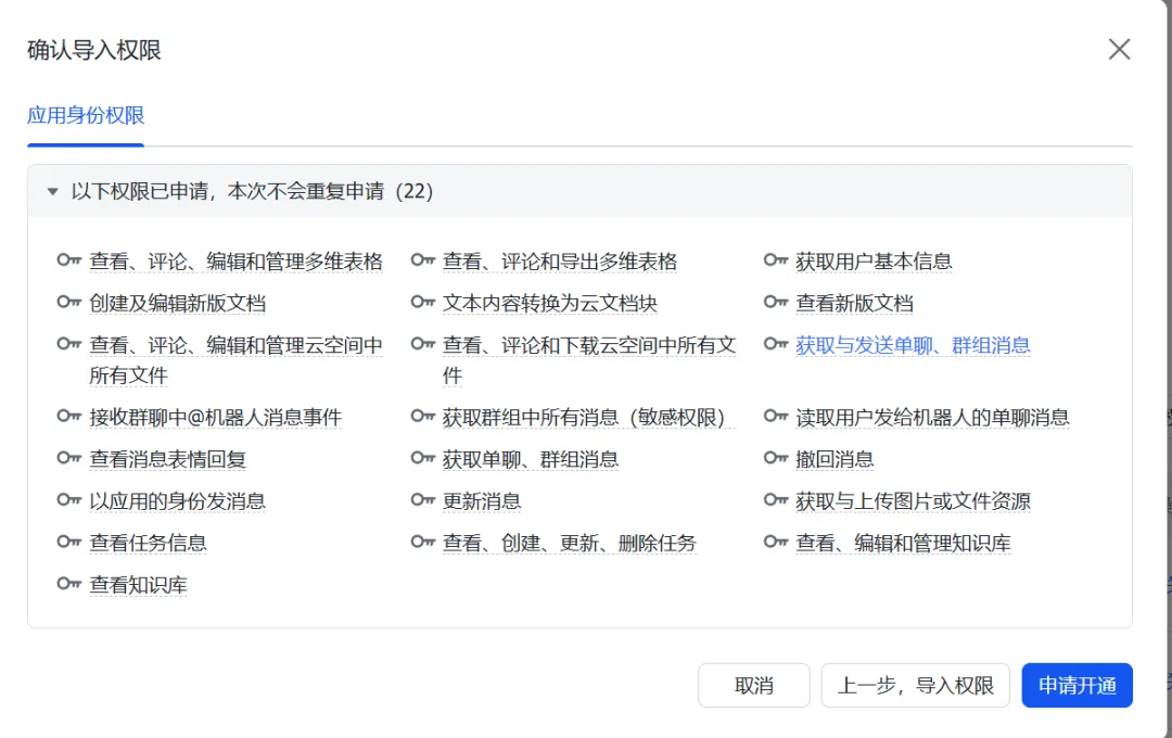 {"scopes": {"tenant": ["im:message","im:message.p2p_msg:readonly","im:message.group_at_msg:readonly","im:message:send_as_bot","im:resource","contact:user.base:readonly","im:message.group_msg","im:message:readonly","im:message:update","im:message:recall","im:message.reactions:read","docx:document:readonly","drive:drive:readonly","wiki:wiki:readonly","bitable:app:readonly","task:task:read","contact:contact.base:readonly","docx:document","docx:document.block:convert","drive:drive","wiki:wiki","bitable:app","task:task:write"],"user": []}}