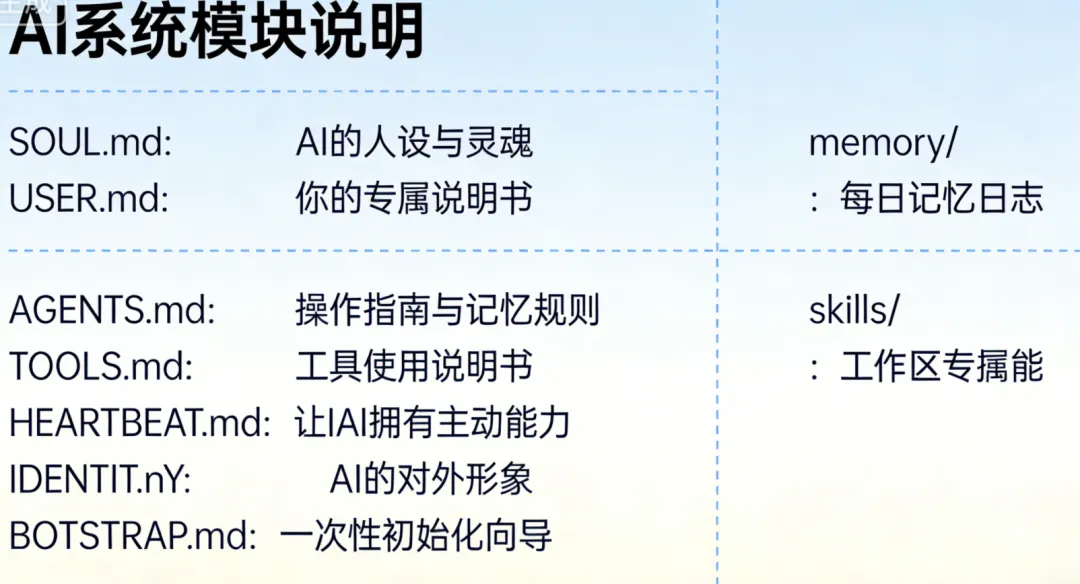 您可以通过ls ~/.openclaw/workspace/查看这些文件,每个文件都有特定用途: