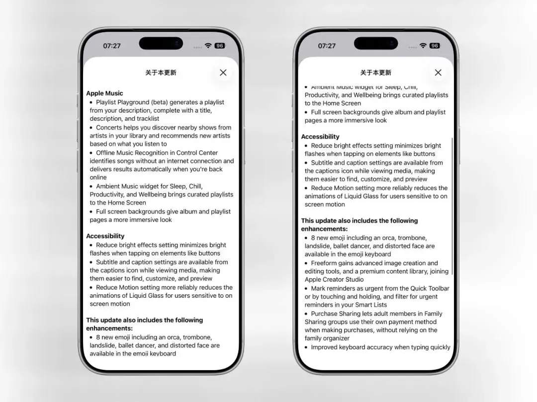 突然发布,iOS 26.4 准正式版来了!今天苹果突然给参与了开发者计划的用户们推送了:■ iOS 26.4 RC 版■ iPadOS 26.4 RC 版■ macOS 26.4 RC 版■ visionOS 26.4 RC 版■ watchOS 26.4 RC 版■ tvOS 26.4 RC 版其中 iOS 26.4 RC 版的版本号是 23E244,从 iOS 26.4 Beta 版本 OTA 更新到 RC 版需要下载完整安装包,iOS 26.4 的主要更新内容如下:■使用全新的 Apple 账户设置界面;■App Store 搜索按钮和搜索框位置调整;■新增减弱明亮效果开关;■新增 8 个新的表情符号;■部分系统墙纸需要获取且可以移除;■Apple Music 新增附近音乐会功能;■Apple Music 专辑封面和播放列表沉浸;■新增两个新的环境音乐小组件;■提醒事项新增紧急模块;■桌面编辑和控制中心菜单液态玻璃;■游戏应用搜索按钮和搜索框位置调整;iOS 26.4 RC 版的发布也就意味着,没有意外的话下周苹果就会发布所有兼容设备都可以更新的 iOS 26.4 正式版。建议各位想升级的用户可以不用升级 RC 版本,直接等 iOS 26.4 正式版发布再升级。