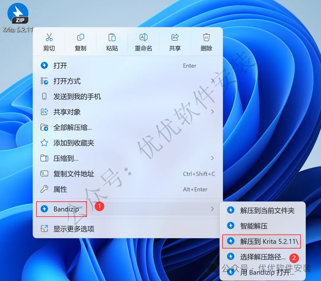 1、下载Krita 5.2.11软件安装包到电脑上,右键选择【解压到Krita 5.2.11\】