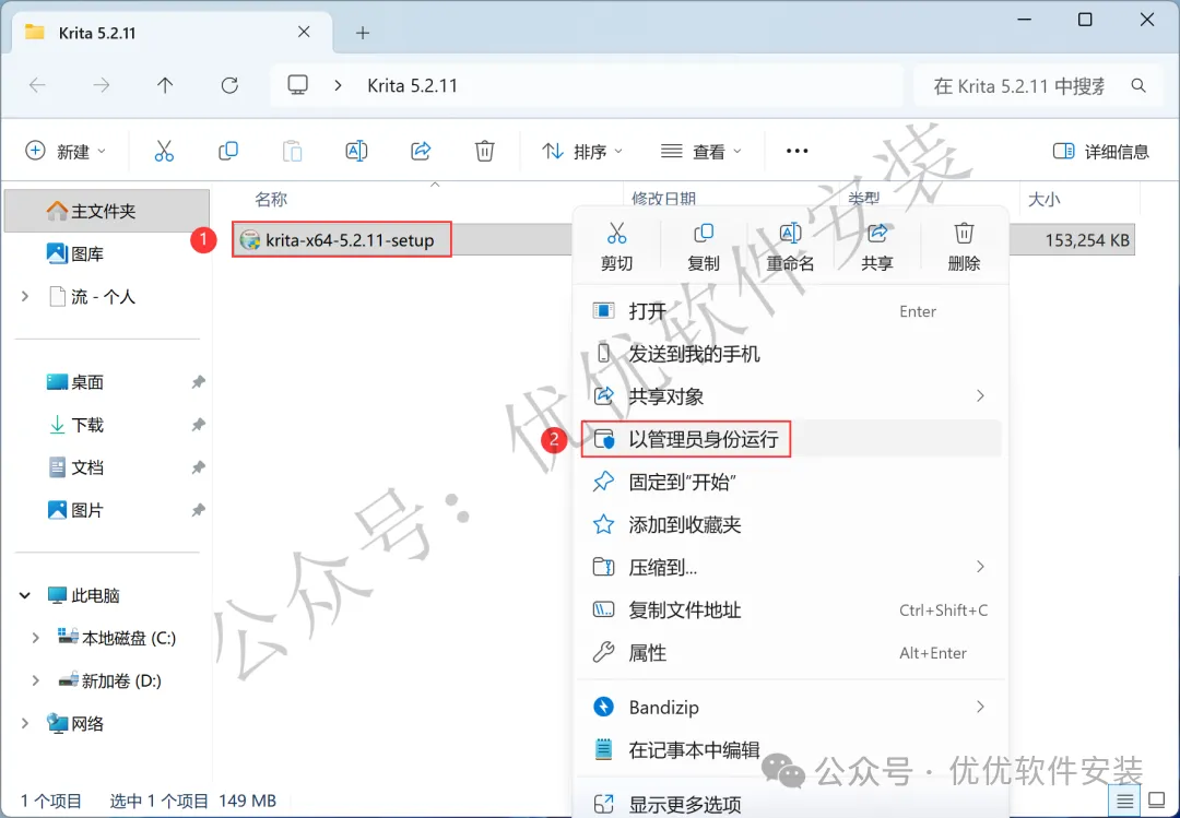 3、找到【Krita-x64-5.2.11-setup】应用程序,右键选择【以管理员身份运行】它