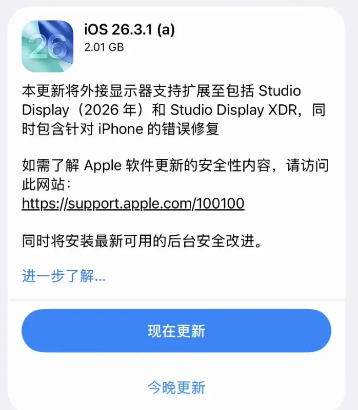 这两天好些iPhone用户在找更新,设置里翻半天没看见那一条,以为苹果没推,其实是推了,只是藏得深,后台那条新提示放出来了,说这次是iOS 26.3.1(a)的紧急安全补丁,不做公开宣传,只面向已经在iOS 26.3.1上的机器发,其他版本看不见。