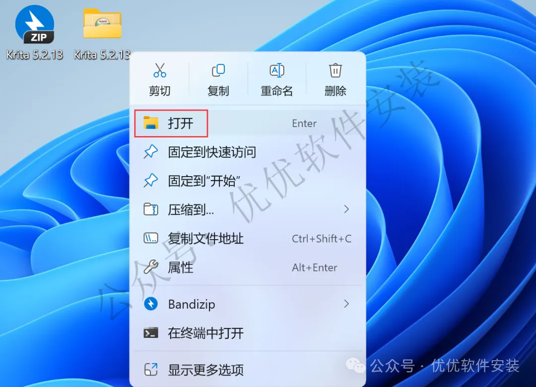 15、回到桌面,右键桌面上的【Krita软件图标】,点击【打开】