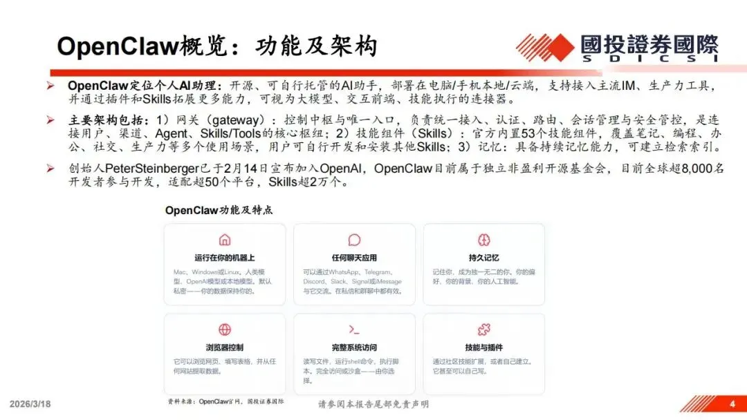 要理解这一轮行情的起因,必须先看懂OpenClaw。它本质上是一个开源的、可自行托管的个人AI助手,可以部署在电脑、手机甚至云端,作为大模型、交互界面与执行技能之间的连接器。OpenClaw的架构设计非常精简且具有逻辑,其核心是网关系统,这个中枢负责统一的接入、路由和安全管控。除此之外,它还拥有庞大的技能组件库,目前官方内置了53个组件,覆盖了编程、办公和社交等多种场景。由于支持第三方开发,目前全球已有超过8000名开发者参与其中,技能总数突破了2万个。这种开源属性让用户能够完全掌控自己的数据,同时也通过持续的记忆能力,让AI越来越像一个了解用户的真实助理。
