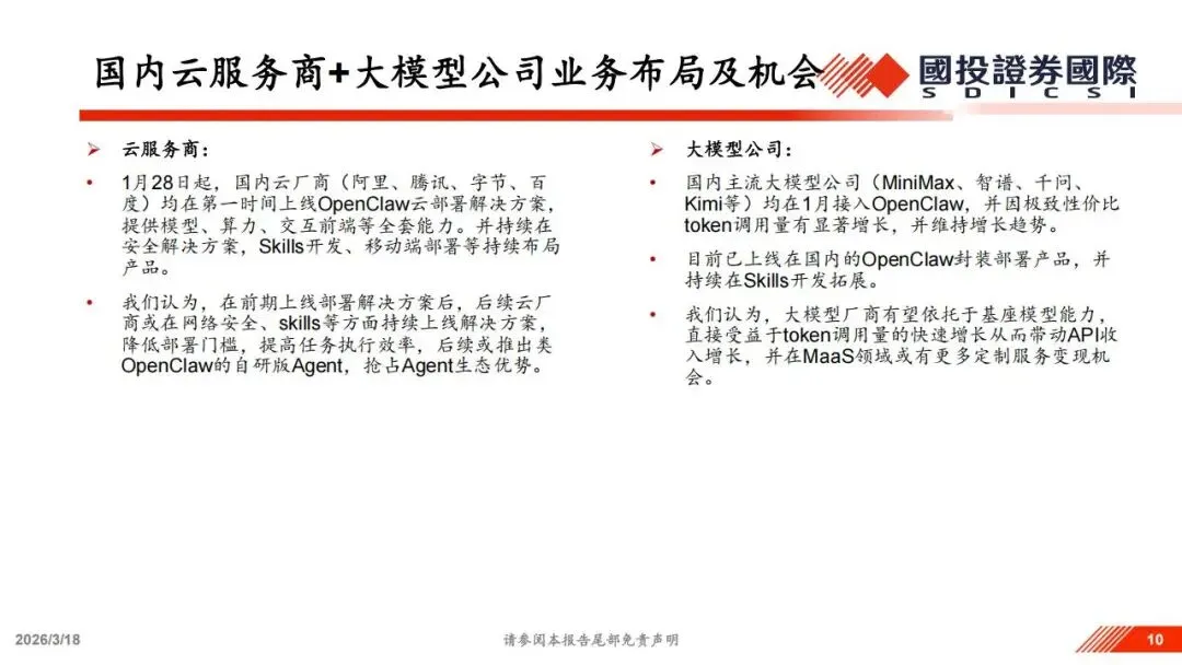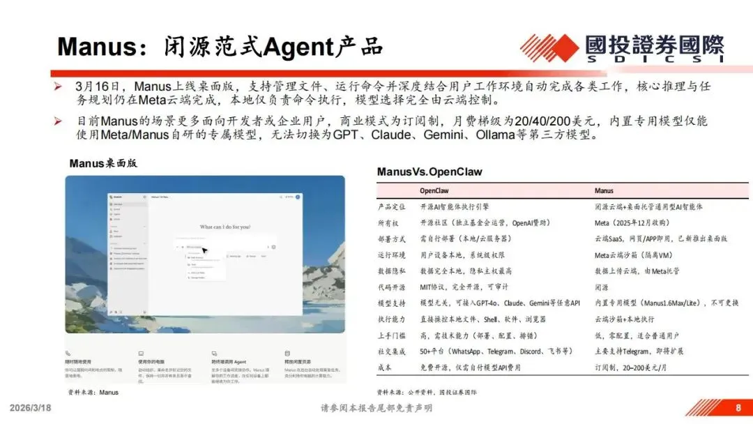 从全球视野看,目前的智能体市场呈现出开源与闭源两种范式的竞争。OpenClaw代表了开源社区的力量,强调隐私主权和多模型接入;而Meta收购后的Manus则代表了闭源SaaS模式,强调低门槛和云端沙箱的安全性。Manus目前采用订阅制,内置专用模型,用户无法切换至第三方模型。两者的差异不仅在于技术路径,更在于商业模式。OpenClaw更适合有一定技术基础、对数据敏感的用户,而Manus这类产品则面向更广大的普通消费者。目前海外巨头如OpenAI、谷歌和Anthropic也都在密集发布各级智能体,无论是原生支持电脑操作的模型,还是针对国防、医疗等垂直领域的专用Agent,都在加速落地。