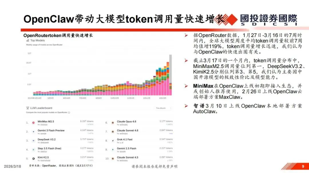 在最近的行业交流中,英伟达等头部企业提出,未来的AI算力需求将更多来自于智能体之间的协作。在这种语境下,token不再仅仅是模型生成的单位,而是变成了一种像电力一样的商品,计算能力则直接转化为企业的收入。随着AI从模型训练转向大规模推理和智能体应用,数据中心的角色也从单纯的成本中心变成了能够直接创造产出的生产系统。这种逻辑的转变直接体现在了数据上,OpenRouter统计显示,在OpenClaw出圈后的短短七周内,全球大模型周度平均token调用量激增了119%,这种爆发式的增长验证了智能体应用对下游流量的巨大拉动作用。