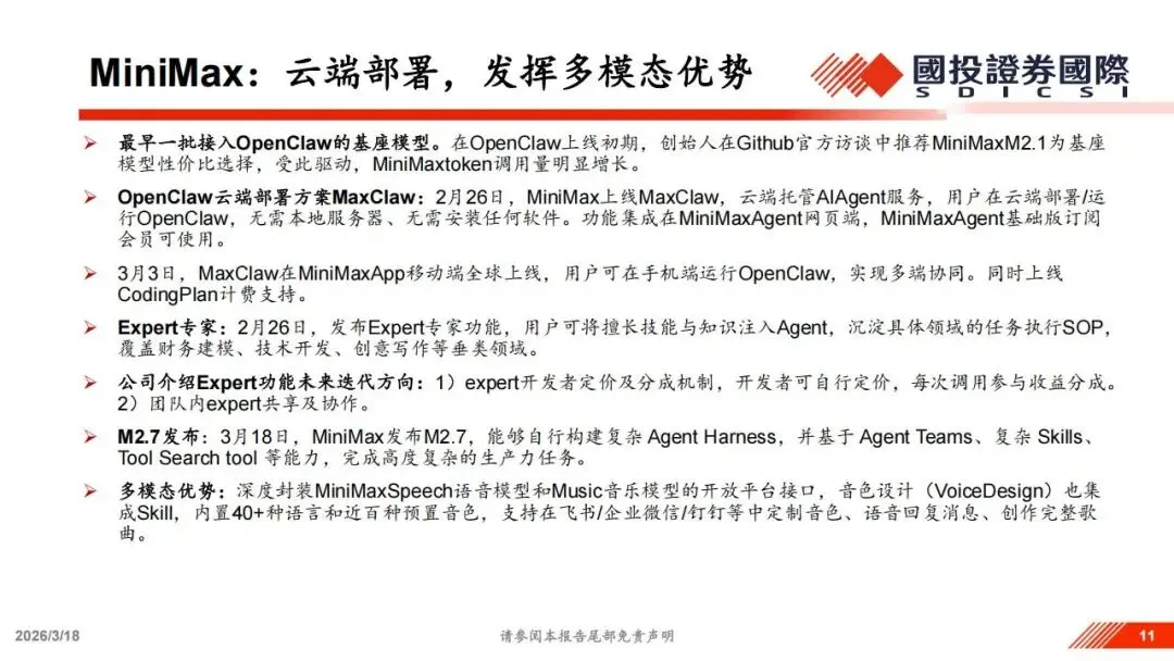 MiniMax的M2.5模型调用量位列第一,DeepSeek和Kimi也紧随其后进入前五。MiniMax作为最早接入OpenClaw生态的厂商,其创始人曾在社交平台推荐过其模型的性价比,这为其带来了显著的流量红利。随后MiniMax推出了MaxClaw方案,支持用户在云端一键托管智能体服务,无需安装任何本地软件。同时,他们还发布了专家功能,允许开发者将特定领域的专业知识注入智能体,并建立了一套分成机制,让开发者可以通过技能调用获得收益。