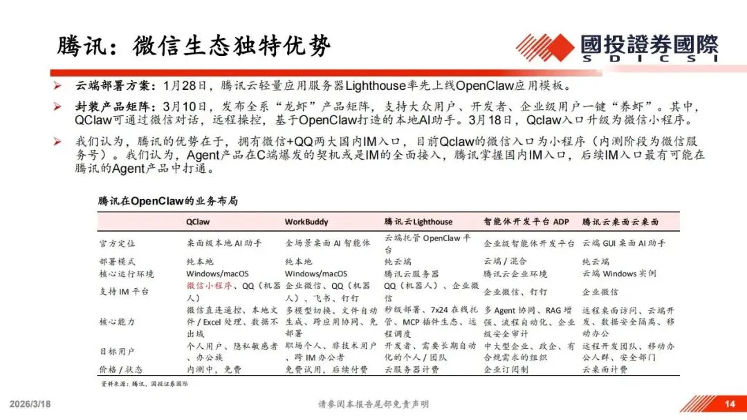 在产品侧,阿里内部正在内测多款类OpenClaw产品,并发布了企业级AI工作平台“悟空”,准备将天猫、支付宝、阿里云等业务能力以技能形式嵌入,形成一个统一的企业级出口。腾讯的优势则在于其庞大的社交生态,他们发布的龙虾产品矩阵中,QClaw支持通过微信对话远程操控本地AI助手,目前该功能已升级为微信小程序。考虑到微信和QQ是国内最核心的社交入口,这种系统级的接入能力可能成为智能体在C端爆发的关键。