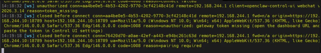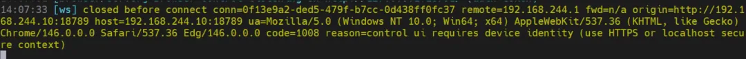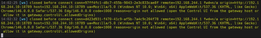 你从 Windows 设备( 192.168.244.1) 访问 OpenClaw 网关(192.168.244.10:18789),但跨域来源未被网关允许,导致 WebSocket 连接在建立前就被关闭(code=1008)。这是 OpenClaw 的安全跨域限制,默认只允许从网关本机访问管理界面。