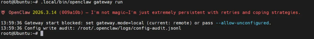 日志提示:Gateway start blocked: set gateway.mode=local (current: remote) or pass --allow-unconfigured