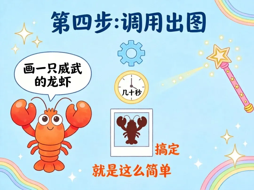 直接告诉OpenClaw龙虾你想要生成的图片描述,比如:"画一只威武的龙虾,深海背景,超写实风格"