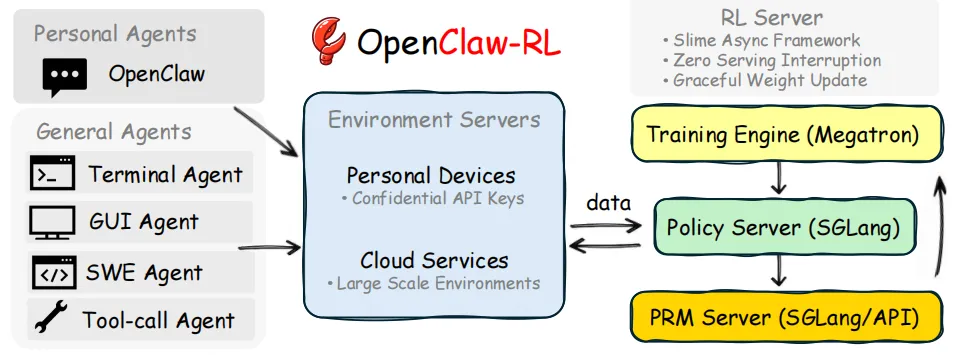 - OpenClaw-RL 基础设施:首个统一多种并行交互数据流的系统,涵盖个人对话、终端、图形用户界面(GUI)、软件工程(SWE)和工具调用智能体场景。设计目标为 “服务无中断”,支持会话感知多轮跟踪、平滑权重更新、灵活的过程奖励模型(PRM)适配和大规模环境并行化。