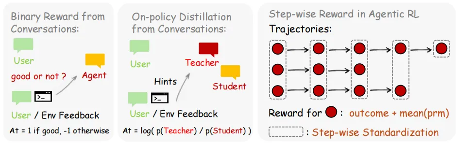 我们将来自异构交互数据流(包括个人对话、终端交互、图形用户界面(GUI)交互、软件工程(SWE)任务和工具调用轨迹)的下一状态信号,转化为策略梯度。