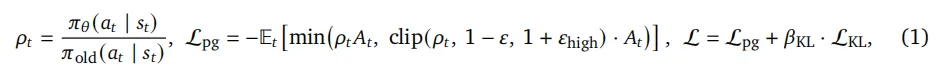 直接采用优势函数At=rfinal,训练目标为带非对称边界的标准 PPO 风格裁剪代理目标(Schulman 等人,2017):