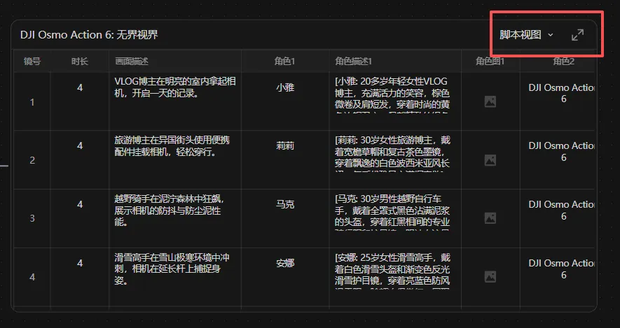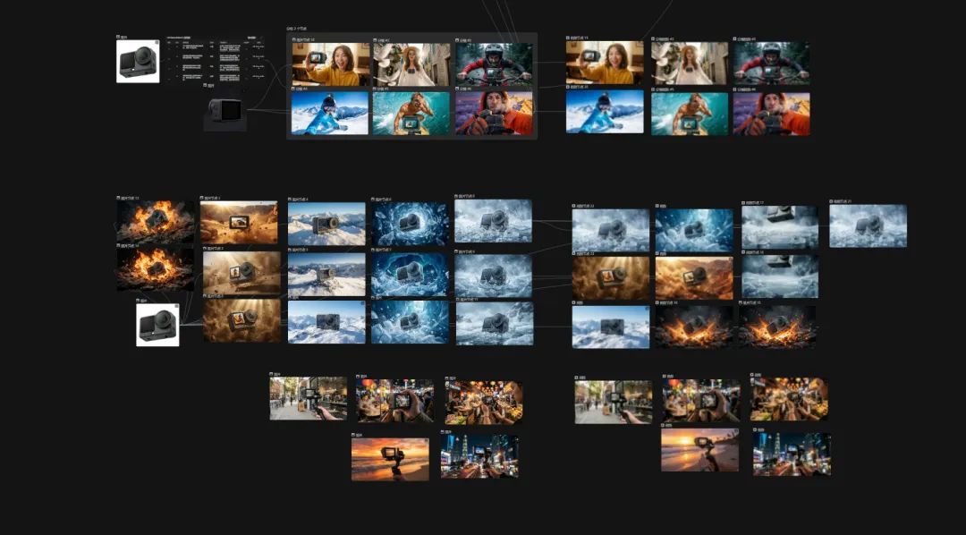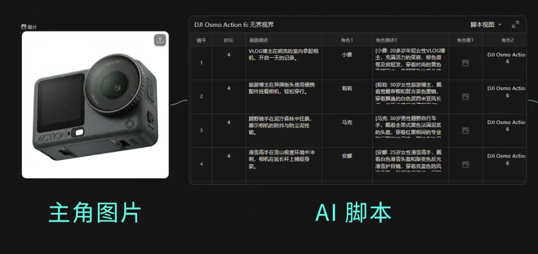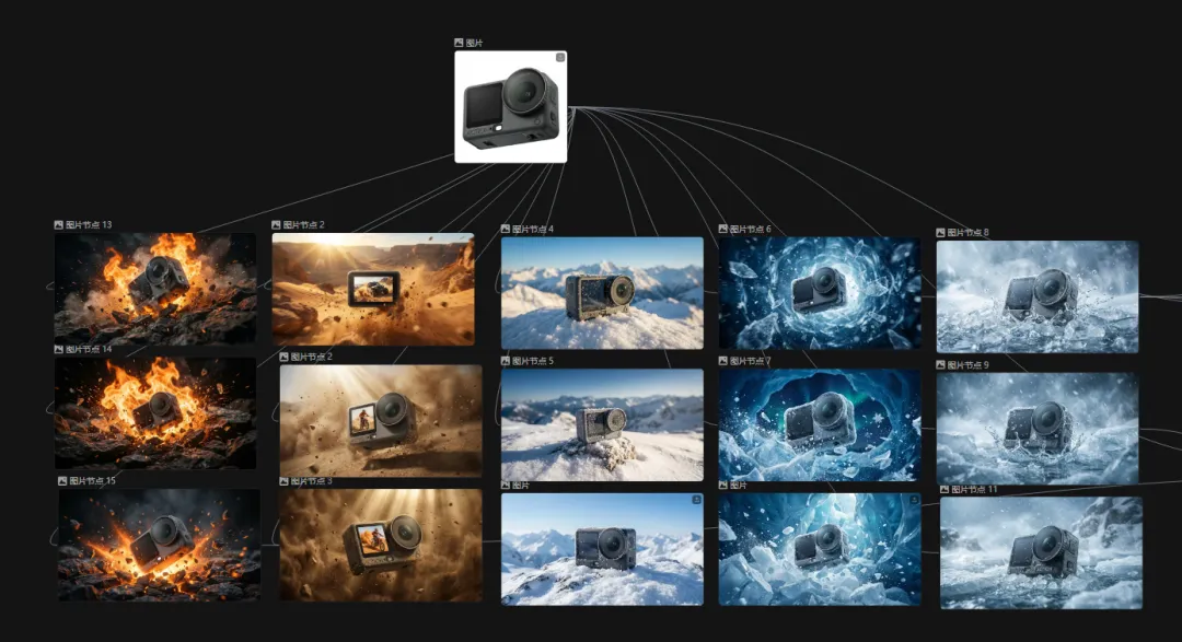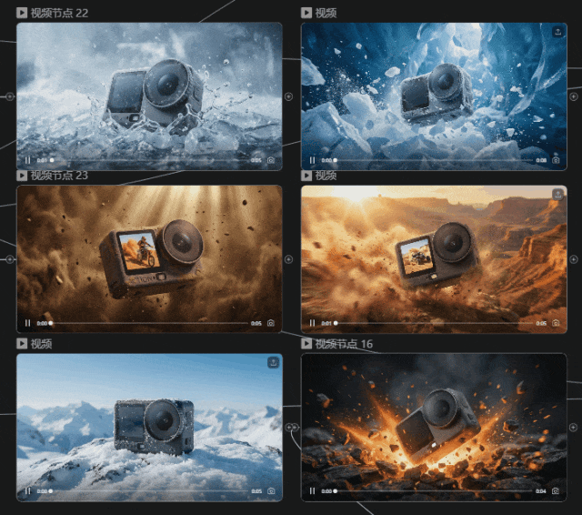 简单地说就是:一个画布,整个项目。从创意剧本,分镜脚本,镜头修改,视频生成,配音配乐,完整创作流程都可以在同一块画布里完成。