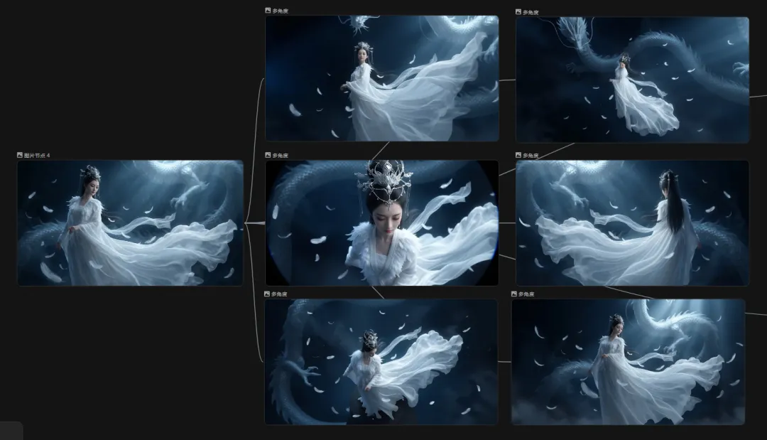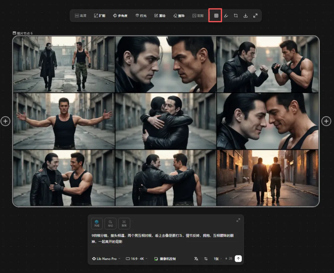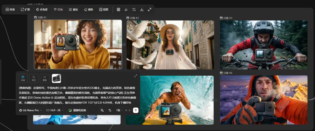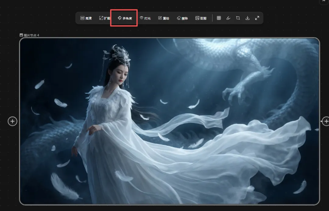 这样就可以轻松修改每一个镜头的画面。选中图像,图像上方是一些常用工具命令,高清,多角度,灯光,抠图等等,例如点击多角度。