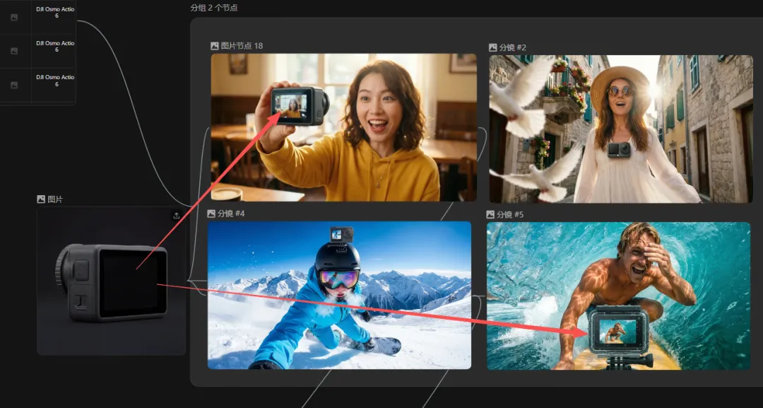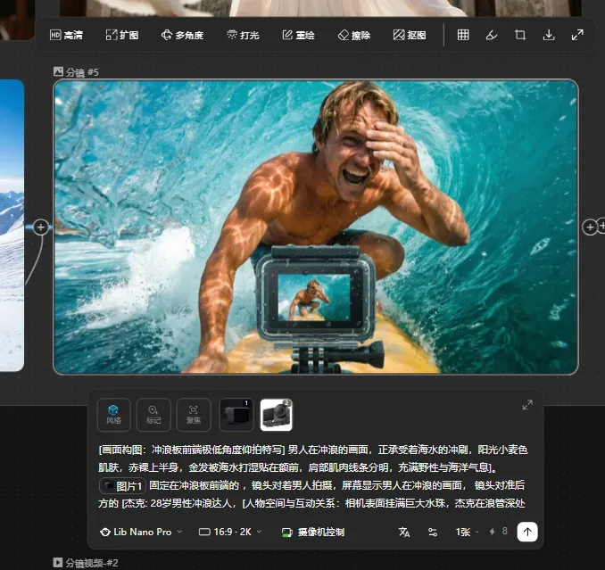 AI生成的难免有BUG与不满意的,比如上面分镜中黄衣服女孩自拍的镜头与男子冲浪的镜头中摄像机是反的,我直接上传一个摄像机背面的图片,节点链接到两张图,提示词,摄像机镜头朝向人物,屏幕显示拍摄内容。