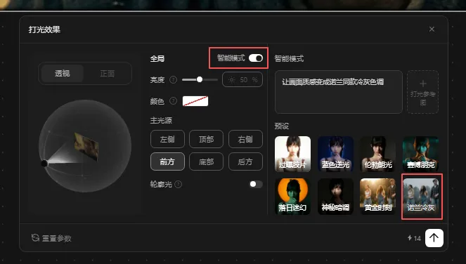 新手可以开启智能模式,下方直接就提供了各种不同的光照效果。