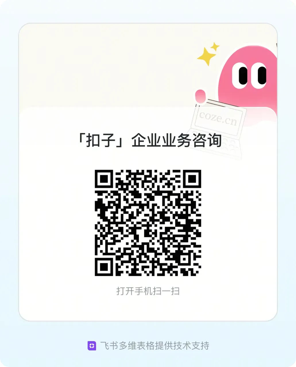 扫描下方二维码,立刻体验扣子企业版,为 AI 落地选择更可靠的方案: