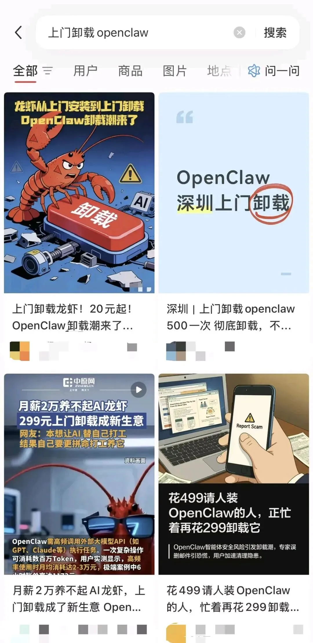 于是你打开某二手平台,颤抖着输入“上门卸载OpenClaw”。搜索结果跳出来,价格从20元到500元不等,服务描述五花八门:“专业卸载,不留后患”、“深圳上门,物理超度你的龙虾”、“月薪两万养不起AI宠物,我们来帮你安乐死”。