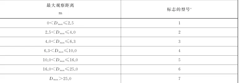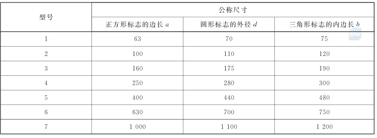 尺寸选择规定:根据最大的观察距离来确定标志的型号,规范划分了7种型号,各种型号(正方形、圆形、三角形)对应边长如下: