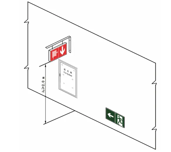 增加:疏散通道内设置的灭火设备标志应采用悬挂安装方式,标志牌所在平面应与疏散方向垂直