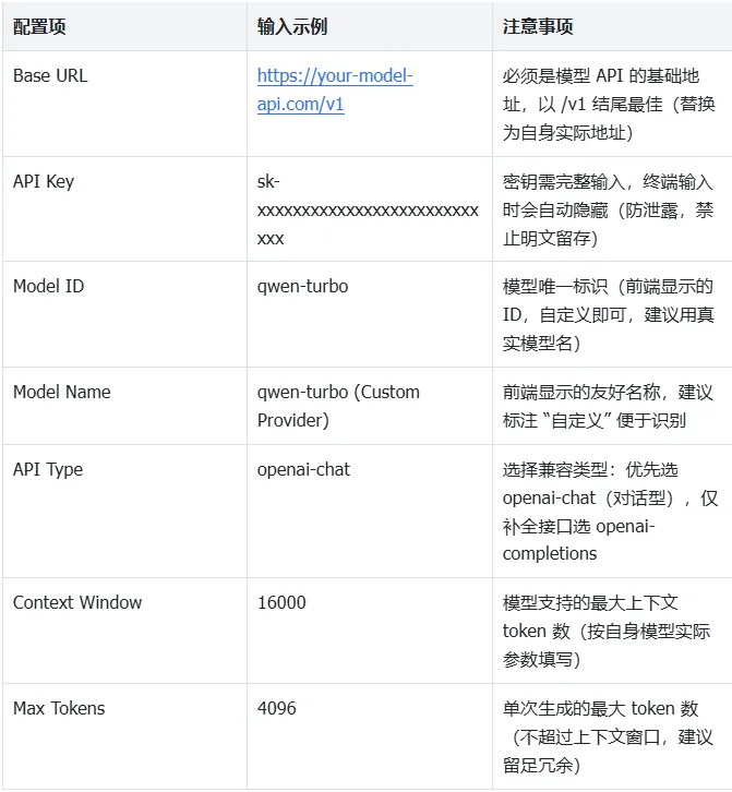 {"models": {"mode": "merge", // 固定值:多模型融合模式,无需修改"providers": {// 自定义提供商名称(可改,建议保留格式:custom-域名-序号)"custom-your-api-example-com-2": {"baseUrl": "https://your-api.example.com/v1", // 【必填】替换为你的模型API基础地址"apiKey": "xxxxx", // 【必填】替换为你的模型调用密钥(绝对保密!)"api": "openai-completions", // 【必填】API兼容类型:openai-completions/openai-chat"models": [{"id": "gpt-5.2", // 【可选】模型唯一标识(前端显示的ID,自定义)"name": "gpt-5.2 (Custom Provider)", // 【可选】前端显示的模型名称,自定义"reasoning": false, // 固定值:是否开启推理,新手保持false"input": ["text"], // 固定值:模型仅支持文本输入,无需修改"cost": { // 固定值:本地/私有模型成本为0,无需修改"input": 0,"output": 0,"cacheRead": 0,"cacheWrite": 0},"contextWindow": 16000, // 【可选】模型支持的最大上下文token数,按实际修改"maxTokens": 4096 // 【可选】单次生成的最大token数,按实际修改}]}}}}
