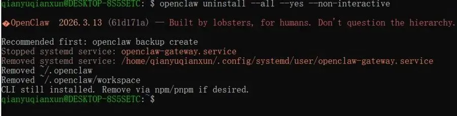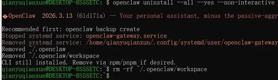 完成这一步后,系统基本就恢复到从未安装过 OpenClaw 的状态。