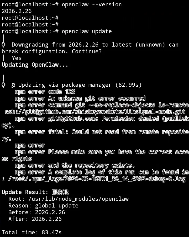 这个错误表明 OpenClaw 在通过 npm 更新时,尝试从 GitHub 通过 SSH 协议拉取依赖(libsignal-node),但遇到了权限问题。