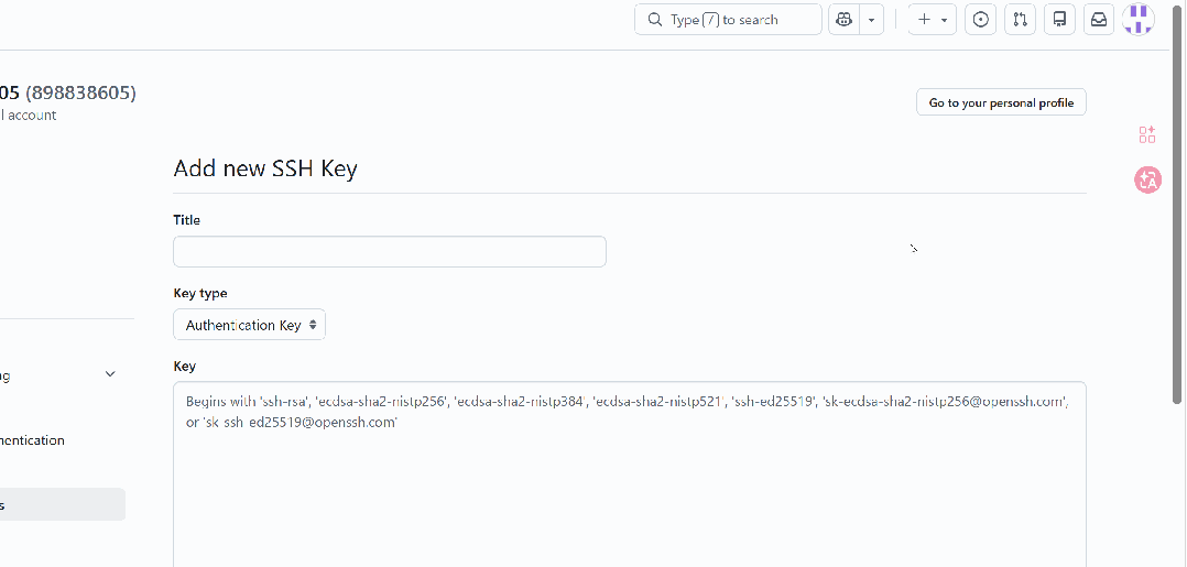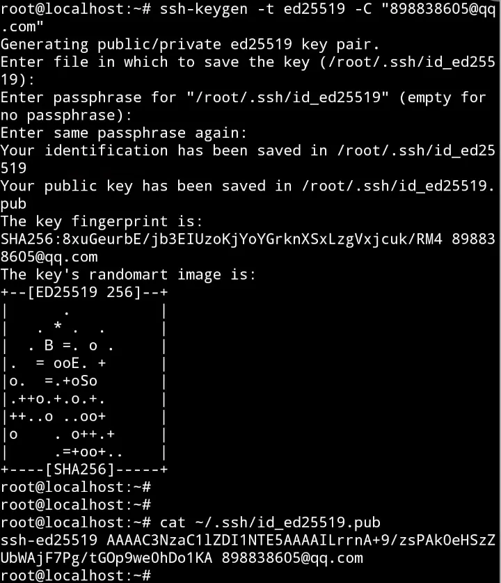 # 1. 生成 SSH 密钥ssh-keygen -t ed25519 -C "填你自己的注册github的邮箱"# 2. 查看并复制公钥cat ~/.ssh/id_ed25519.pub# 3. 将公钥添加到 GitHub: https://github.com/settings/keys