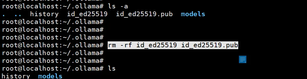 #进入ollama目录cd ~/.ollama/# 查看当前目录文件ls# 删除id_ed25519 id_ed25519.pub,这是两个授权文件rm -rf id_ed25519 id_ed25519.pub#重新启动ollamaollama serve &