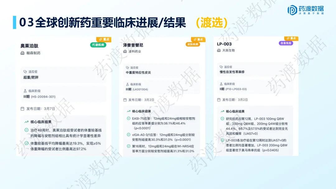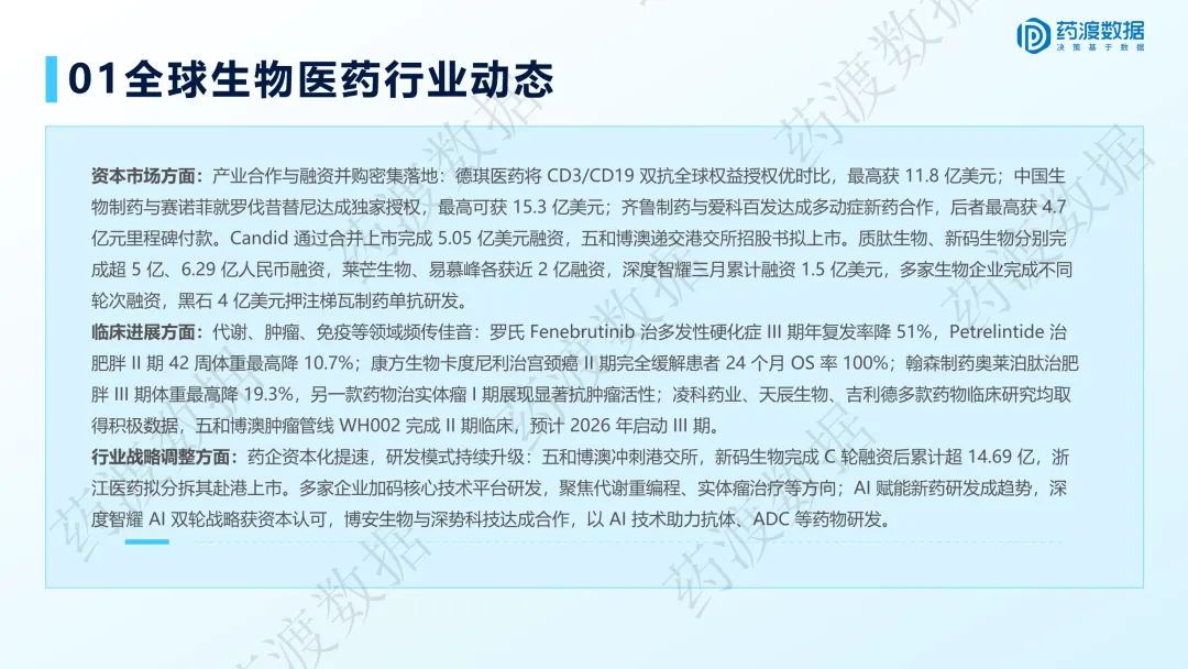 | 热门赛道 | 代谢(GLP-1)、肿瘤(双抗)、自免 | 三大赛道临床与商业化进展最为密集 |