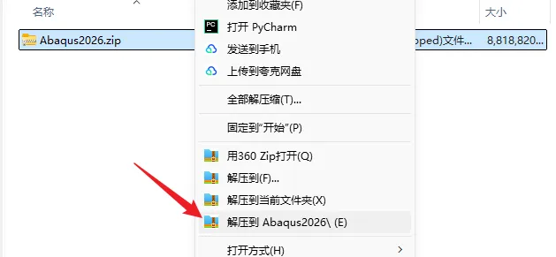 1.解压安装包:鼠标右击【Abaqus 2026 】压缩包,选择电脑上安装的解压软件,点击【Abaqus 2026】。