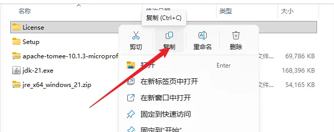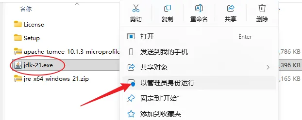 2.打开解压后的文件夹,鼠标右击【jdk-21】选择【以管理员身份运行】。