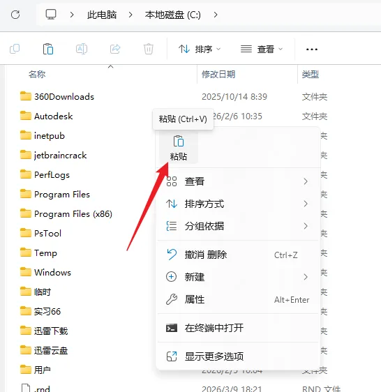 8.打开电脑【C盘】,在空白处鼠标右击选择【粘贴】。