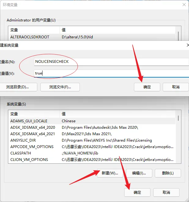 14.在系统变量下点击【新建】,输入变量名:【NOLICENSECHECK】,输入变量值:【true】,然后依次点击【确定】。